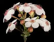 The flowers are arranged in rounded or corymb-like groups near the ends of the long flowering stems, each flower on an erect stalk, 6–13 mm (0.2–0.5 in) long. The floral cup is about 1.5 mm (0.06 in) long and covered with short, soft hairs. The sepals are white, sometimes pale pink, spreading but curving upwards, 3–4 mm (0.1–0.2 in) long, with 8 to 12 hairy lobes and two ear-shaped, hairy appendages on the sides. The petals are the same colour as the sepals, egg-shaped to almost round, 2.5–5 mm (0.1–0.2 in), spreading with a smooth edge and are joined with the ring of stamens and staminodes, to form a short tube. The style is less than 0.5 mm (0.02 in) long, straight and glabrous. Flowering time is from September to December.[3]