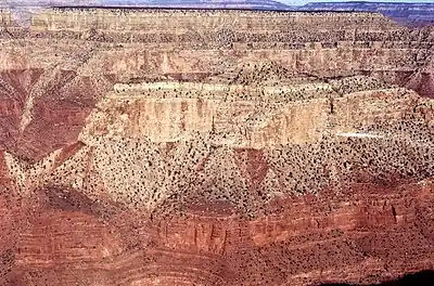 The summit of Vesta Temple is composed of Permian Kaibab Limestone and Toroweap Formation overlaying cream-colored, cliff-forming, Permian Coconino Sandstone.[7] The sandstone, which is the third-youngest of the strata in the Grand Canyon, was deposited 265 million years ago as sand dunes. Below the Coconino Sandstone is reddish, slope-forming, Permian Hermit Formation, which in turn overlays the Pennsylvanian-Permian Supai Group.[8] Further down are strata of the conspicuous cliff-forming Mississippian Redwall Limestone, the Cambrian Tonto Group, and finally granite of the Paleoproterozoic Vishnu Basement Rocks at river level in Granite Gorge. Precipitation runoff from Vesta Temple drains northeast to the Colorado River via Topaz Canyon and Boucher Creek.