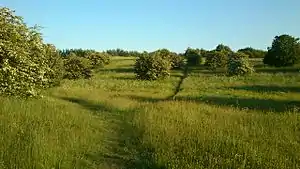 The nature of Vestereng comprise meadows, scattered vegetation and a woodland area. There are a number of smaller ponds here and a stream is running through the area to join the larger Egå, a few kilometres north of here. The meadows are very popular with moles apparently, as evidenced by the many molehills. Hawthorns is the most common tree at Vestereng and they also forms a peculiar habitat of hawthorn-forest.