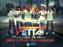 Vettai : Pledged to Hunt (Tamil: வேட்டை; English: Hunt) was the first season of Singapore's Tamil, 72-part crime drama, Vettai. The series ran on-air from 23 November 2010 to 30 March 2011, every Monday to Thursday, at 10:30 pm on the MediaCorp Vasantham channel. The season was directed by Anuratha Kanderaju and Abbas Akbar.