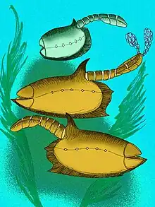 The type species, Vetulicola cuneata, as originally described by Hou Xian-guang in 1987, has a body plan similar to those of arthropods and composed of two distinct parts of approximately equal length.[3] The anterior part is rectangular with a carapace-like structure of four rigid cuticular plates, with a large mouth at the front end.[4] The posterior section is slender, strongly cuticularised and placed dorsally. Paired openings connecting the pharynx to the outside run down the sides. These features are interpreted as possible primitive gill slits. Vetulicola cuneata could be up to 9 cm long. The Vetulicola are thought to have been swimmers that were possible filter feeders.[5]