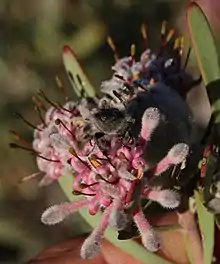 The pointy, oval bracts subtending the individual flower are 5–7 mm (0.20–0.28 in) long and 2½–3 mm wide, thickly woolly, tightly encircling the foot of the flower. The 4-merous perianth is 1–1½ cm (0.4–0.6 in) long and straight. The lower part, that remains merged when the flower is open, called tube, is hairless and 2–3 mm (0.08–0.12 in) long, are somewhat flattened on the four sides. The segments in the middle part (or claws), where the perianth is split lengthwise, are cream to pink in colour, thread-shaped, all curve back towards the tube as soon as the flower opens. The segments in the upper part (or limbs), which enclosed the pollen presenter in the bud, are about 3 mm (0.12 in) long, lance-shaped and the outside surface is covered in very fine short felty hairs. The black anthers are directly merged to each of the limbs, elliptic in shape, about 2½ mm (0.1 in) long, and a pointed extension on the tip. From the centre of the perianth emerges a straight, initially yellowish-green but later deep claret-coloured style of 1–1⅓ cm (0.4–0.5 in) long. The thickened part at the tip of the style called pollen presenter is bluntly hoof-shaped 1½–2 mm (0.06–0.08 in) long, initially greenish and turning amber with age. On the very tip is a minute pore that functions as the stigma. The downy hairy ovary is egg-shaped, about 1 mm (0.04 in) long and well differentiated from the style. The ovary is subtended by fout awl-shaped, opaque scales of about 1 mm long.[3]