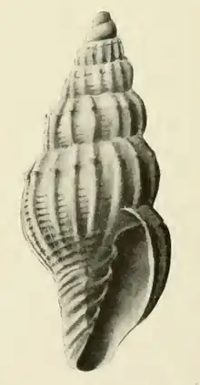 Sculpture : perpendicular ribs widely spaced, about seventeen on the body whorl, diminishing and alternating n ascent from whorl to whorl, knotted at the shoulder and fading at the base. The spirals occur as six prominent cords on the snout, above which a dozen threads become fainter as they ascend, traverse the interstices but not the ribs. About six of these ascend the spire. The aperture is pyriform. The outer lip is simple. The columella shows with four well developed, spaced, oblique plaits. [2]