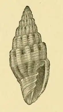 (Original description) The white shell is fusiform. The spire tapers towards the apex. The solid whorls are gradate, impressed at the sutures, nine or ten in number. They are longitudinally costate, the ribs being thick, shining, whitish, smooth, with interstitial transverse deep sulcation. The shell is painted with chestnut-ochre spotting at the interstices, just below the sutures, the lower part of the upper whorls being plain. The body whorl has a white band towards the middle, the chestnut-ochre suffusion extending thence over the base, which is attenuate. The aperture is narrow and oblong. The outer lip is simple. The columella is straight and four-plaited.[2]