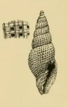 (Original description) The shell is stout, narrow-fusiform, ending in a sub-cylindric protoconch of two smooth whorls. The shell contains six whorls, excluding the protoconch, slightly convex. They are sculptured with broad, flat, transverse ribs, and by narrower spiral ones, which include between them large, roundly oblong depressions. There are eight rows of punctures on the penultimate whorl. The body whorl is a little sloping to the suture, but slightly attenuated to the bent and reverted short beak. The aperture is narrow, oval-oblong, with a spiral callosity at the posterior angle. The outer lip is thin, slightly ecurved medially, stoutly lirate within. The columella has four thick approximate plaits, increasing in size from the front.[2]