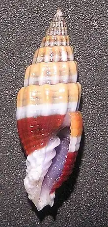The shell size varies between 5 mm and 20 mm. The shell is somewhat fusiform in shape, decreasing in size at its base. The spire tapers to a slender point, its sutures (parts dividing one whorl from another) are deep and ribbed lengthwise. The shell has interstices crosswise deeply lineated, crosswise and its ribs are blunt. The upper whorls are yellow, while the body whorl is encircled in crimson red. Its columella (central column) is four plaited.[2]