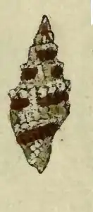 (Original description) The subfusiform shell is yellowish, clouded with salmon and red. It is armed with rather distant ribs, bluntly spinose at the angle, with two tubercles in the middle, and spiral striae. The spire is turreted. The body whorl is ventricose to the middle, contracted anteriorly. [2]