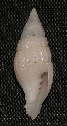 The turreted shell has a fusiform shape. It has a uniform, delicate rose-tint, and is finely cancellated throughout. The whorls are swollen behind, and attenuated and recurved in front. The columella is four-plaited. The base of the shell slightly contorted and recurved.[2]
