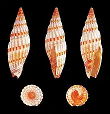 The shell is yellowish white to ash color, the ribs tipped with scarlet, sometimes with one or more chocolate bands, base and apex chocolate.[3]