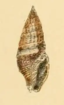 (original description) The shell has an oblong-fusiform shape, with a sharp, brown apex. The shell contains twelve whorls. The penultimate whorl and the body whorl are smooth, whilst the rest are highly sculptured The whorls are longitudinally ribbed. Their interstices are clathrate. The columella is three- to four-plaited. The aperture is narrow. The outer lip is simple. The shell is of a lead-colour, darkly painted with fine rusty wavy lines and with a pale single band at the body whorl. [2]