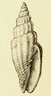 (Original description) A striking, solid, fusiform shell of a chalky-white colour. The shell contains nine whorls. It is neatly longitudinally costate, delicately transversely striate. The upper whorls are once, the last whorls twice banded concentrically. The ribs are, except on the dorsal surface of the body whorl, left white and uncoloured. The body whorl is bicingulate. The aperture is narrow and straight. The columella is thrice plaited. The siphonal canal is almost straight, and hardly recurved at the base.[3]