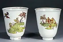 The great majority of wares are teaware: cups, saucers, teapots and a few small plates. Many cups are beakers without handles, and the teapots, which form an unusually large proportion of the surviving pieces, often have moulded shapes, including relief decoration. The bodies can be white, but often tend to grey; they are very translucent. The shapes often draw from silverware, but they are brightly painted in a variety of styles, influenced by the northern factories and Asian export wares.[4][5]