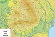 The Vișeu (Hungarian: Visó) in northern Romania is a left tributary of the river Tisza.[1][2] Its source is in the Rodna Mountains. It passes through the following villages, communes and cities: Borșa (city), Moisei (commune), Vișeu de Sus (city), Vișeu de Jos (commune), Leordina (commune), Petrova (commune), Bistra (village), Valea Vișeului (village). In Valea Vișeului village, the river flows into the Tisza.[3] Its length is 82 km (51 mi).[4][2] Its drainage basin covers an area of 1,581 km2 (610 sq mi).[5]: 23 [2]