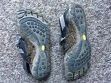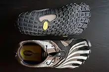 The Vibram FiveFingers are a type of minimalist shoe manufactured by Vibram, originally marketed as a more natural alternative for outdoor activities (sailing, kayaking, canoeing, and as a camping or after-hike shoe).[1] The footwear is meant to replicate being barefoot and has thin, flexible soles that are contoured to the shape of the human foot, including visible individual sections for the toes.[2] The company settled a lawsuit in 2014 alleging false health claims and set aside $3.75 million to pay refunds of up to $94 to anyone who had purchased the product since March 21, 2009.[3]