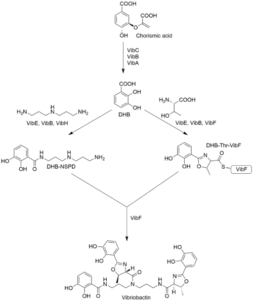 The components of vibriobactin are three 2,3-dihydroxybenzoic acid (DHB), two threonine (Thr), and one norspermidine (NSPD). DHB is synthesized from chorismic acid by a series of enzymes: VibA, VibB, and VibC. DHB is linked to NSPD by VibE, VibB and VibH in order and forms DHB-NSPD.[2] On the other hand, DHB performs condensation and cyclization with Thr by VibE, VibB, and VibF to form the heterocyclic molecule linked on VibF: DHB-Thr-VibF. DHB-NSPD and DHB-Thr-VibF are then put together by VibF to form vibriobactin.[3]