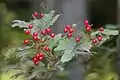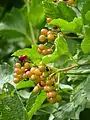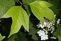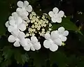 Viburnum sargentii is a species of flowering plant in the family Adoxaceae (formerly Caprifoliaceae), native to north eastern Asia. Growing to 3 m (10 ft) tall and broad, it is a substantial deciduous shrub with 3-lobed, maple-like leaves, often turning red in autumn. Flat white flower-heads (cymes) resembling those of lacecap hydrangeas are borne in early summer. The outer florets are saucer-shaped and sterile, while the central tubular flowers are fertile. The flowers are followed in autumn by globose red berries.