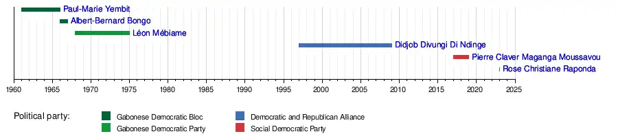 May 1997 | October 2009 | 12 years, 5 months | ADERE | O. Bongo Himself Rogombé |