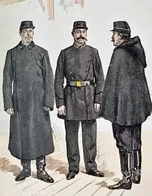 The reputation of the cent-gardes in this area was of a joking manner: a humorous engraving at the time, published by the Le Bon Marché, was that of a cent-gardes officer, back at his quarters at the end to the Court, busy emptying his boots filled with love letters by admirers while he was standing still.[10]