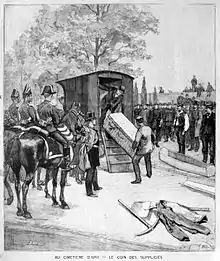 However, legal procedures required a mock burial in the cemetery. Immediately after the execution, the coffin containing Prévost's body and head was loaded with a bran container into a van that went off on the field with a great trot, escorted by mounted gendarmes, to go to the hospice cemeteries which adjoined Ivry Cemetery. It was followed by three cars, carrying the chaplain, accompanied by the head of the security services and the journalists. At precisely 7:45, the van stopped near an open pit surrounded by gravediggers. Prévost's body was exhumed from the coffin, placed in a light wooden coffin, with his head slipped between his legs. Father Crozes recited a final prayer before the coffin was temporarily closed with two nails. Ultimately, the pit become bloodied, which came from the bottom of the coffin. At the end of the brief ceremony, the coffin was loaded into a medical van, which immediately left towards the medical faculty.[5][18]