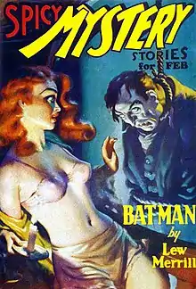 Cover of the pulp magazine Spicy Mystery Stories (February 1936, Vol. 2, no. 4) featuring Batman under the Lew Merrill name.