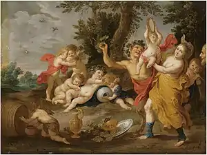 Although there is no evidence Wolfvoet studied under Rubens, he is considered one of the most faithful followers of that artist.[9] He often used paintings or preparatory drawings or oil sketches by Rubens as the model for his paintings. He had access to some of these through his art business and public sales of Rubens' work in the Antwerp market.[8][9][12] Examples are two copper paintings relating to the theme of the War between War and Peace (private collections) and an oil on canvas of Hercules and Minerva Expelling Mars (Hermitage Museum) (of which there also exists a copy on copper). In the first two copper paintings he used a palette similar to that of Rubens and achieved a harmony of tone with space, which he had learned from Rubens.[9]