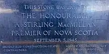The cornerstone reads: This stone was laid by The Honourable A. Stirling MacMillan Premier of Nova Scotia September 5, 1945, Brookfield Construction Co Ltd. Andrew R Cobb Architect and C. St. J. Wilson Associate.
