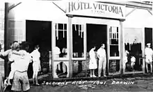 During World War II the hotel was occupied by United States and Australian naval authorities who remained there until the end of the war. In September 1941, rioting soldiers in the Darwin city area caused superficial damage to the hotel, such as broken windows and furniture.[14] With many troops stationed in Darwin, a fight broke out in the hotel that quickly spread outside into Smith Street. Although the damage was blamed on the soldiers, records show that civilians were involved in the riot.[15]