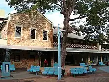 The Victoria Hotel was built by Ellen Ryan, one of the Territory's wealthiest women, who owned land and several mining leases. In 1888 Ryan moved into the Territory hotel trade, lodging a successful application with the licensing board for a prestigious hotel to be built at 27 Smith Street in central Darwin, then known as Palmerston, during the northern Australia gold rushes of the 1870s onwards.[1][2] Constructed by H.C. Debross, it was built for £4,000 and was the first stone building in Darwin.[3] The two-storey hotel was made of local, multi-coloured porcellanite stone, with a facade dominated by a parapetted gable and verandahs.[4] Upon completion, the building dominated Smith Street and remained that way for over half a century.[5]