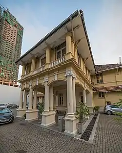 In 1897 a gathering of senior freemasons proposed the construction of a temple building in commemoration of Queen Victoria’s Diamond Jubilee but construction was delayed to accommodate the land acquisition, preparation of plans and the raising of funds. After the necessary funding was raised by subscription and debentures, the cornerstone of the building was laid on 27 September 1900 by John Norman Campbell, a freemason and a philanthropist, and the building was completed in August 1901 with a formal opening on 1 September 1901.[2] The temple was designed by Edward Skinner, a Freemason and an associate of the Royal Institute of British Architects, and built by the Colombo Commercial Company.[3][4] The building was built in neo-Georgian style mixed with elements of Eastern architecture.[3] The Ceylon Independent stated on 2 October 1901:
