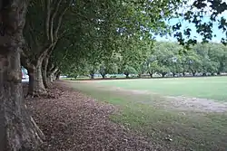 A park located west of the Auckland central city was mooted at a Council meeting in 1884.[1] Victoria Park opened in 1905 by mayor Arthur Myers, after the reclamation of Freemans Bay was completed.[2][1] The artificial creation of the land is why it is very flat and level – it was intended from the start to be primarily a facility for active events augmenting the other public parks; Western Park 1876 and Albert Park 1884 which were for more genteel passive enjoyment. For this reason the park was not laid out in a picturesque manner, neither has it ever had decorative flower beds. The first grandstand pavilion was opened in 1906.[1] As a sports facility for the adjacent working class areas and industrial zones it was provided with a sports pavilion and edged with trees to give shade for spectators. These are London plane trees (planted in 1905 for the opening of the park),[3]