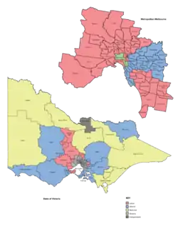 Electoral boundaries are redrawn from time to time, in a process called redivision. The last redivision took place in 2021, when the Victorian Electoral Boundaries Commission reviewed Victoria's district boundaries. The boundaries arising from the 2013 redivision applied at the 2014 and the 2018 state elections.[1] Previous redivisions took place in 2005, 2001 and 1991.[2] A redivision is currently in progress and is expected to be completed by October 2021.[3]
