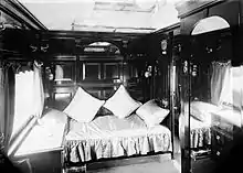- State Car 5 was based on the steel air-conditioned S type carriage design in 1951. Royal insignia were painted on each side.[6] The carriage featured a kitchen, lounge/dining area, two main bedrooms with en-suite facilities (a bathroom with a bath, basin, shower and toilet), two sleeping/sitting compartments for attendants, and a third bathroom. In 1954 it was displayed at the Centenary Exhibition.[7] It was repainted into the grey livery in 1988 for the royal tour of the year, and has since been allocated to the Seymour Railway Heritage Centre collection.[8]