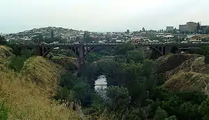 The Victory Bridge or Haghtanak Bridge (Armenian: Հաղթանակի կամուրջ Haght'anaki kamurj) is an arch bridge for traffic linking across the Hrazdan River in Yerevan, Armenia. It connects the Mashtots Avenue in the east with the Admiral Isakov Avenue in the west. It was opened on 25 November 1945 and named the Victory Bridge to commemorate the Soviet victory over Nazi Germany at the end of World War II.[1]
