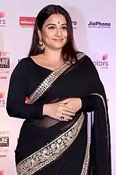 Her starring roles in Heyy Babyy and Kismat Konnection also led to considerable attention in the media for her "questionable wardrobe". Several publications listed her as the "worst dressed actress" and her costume designers attributed her failure to carry off western clothes due to her weight and body structure.[185][186][187] She was later praised in the media for wearing saris at public events; designer Niharika Khan explained, "Vidya's beauty lies in her curves. She's comfortable in her voluptuousness, and therefore in a sari."[188] Vidya has since been identified as defying "an anglicised idea of sexuality" and embody the idea of "raw Indian sexuality".[182]