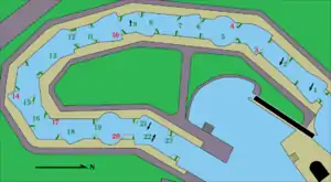 The course was designed by Hydrostadium, the French engineering firm responsible for many of the world's artificial whitewater courses.[2] The chief financial backer is Vienna Watersports Arena, Austria's largest electricity producer—hence the German language name "Vienna Watersports Arena."[3] Its modest cost of 5.1 million € ($6.4 million)[2] is one-fourth the cost of the similar facility at Cardiff and only 13% of the cost of Lee Valley, the large venue built for the 2012 Olympics in London. It meets the minimum Olympic standards of 250 meters, 1.5% slope, and 12 m3/s (420 cu ft/s) streamflow. The concrete channel has vertical sides, with concrete steps in the eddies formed by wide spots. The flow diverters are adjustable hexagonal green plastic bollards.[2]