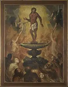 In the Church of Saint Walpurga of Veurne hangs his painting entitled They cleaned their souls in the blood of Christ. This canvas, painted around 1663, was intended for the altar of the Broederschap der Overledene Zielen in het Vageveur (Brotherhood of the Dead Souls in Purgatory), which had just been founded by pastor Jacob de Wieu. It shows purgatory with people amongst the flames begging for God's mercy for their souls. Christ is shown standing on a fountain-like elevation with blood pouring out of his wounds. In the foreground, two angels are lifting two female figures out of the pool of fire showing how Christ's sacrificed blood saves the souls. The Latin words "de albaverunt eas in sanguine agni" (They cleaned their souls in the blood of the lamb) are written on side of the elevation on which Christ is standing.[8] For this church Boucquet also painted a Martyrdom of Saint Sebastian. The Saint Nicolas Church in Veurne also holds a Martyrdom of Saint Sebastian. The work was commissioned by the Sint-Sebastiaans hand bow guild of Veurne for the Saint Sebastian altar in this Church.[9]