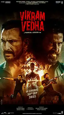 Vikram Vedha is a 2022 Indian Hindi-language neo-noir action thriller film written and directed by Pushkar–Gayathri and jointly produced by YNOT Studios, Friday Filmworks, Reliance Entertainment, T-Series Films and Jio Studios. A remake of the director duo's 2017 Tamil film of the same name, it is inspired by the Indian folktale Baital Pachisi and stars Saif Ali Khan and Hrithik Roshan as the titular anti-heroes.[4] Radhika Apte, Rohit Saraf and Yogita Bihani play supporting roles. In the film, a police officer sets out to track down and kill a dreaded gangster.