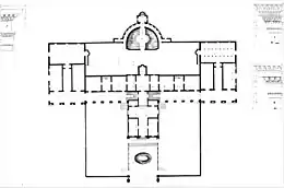 Palladio planned the villa on low lines extending into a large park. The ground floor plan is complex: rectangular with perpendicular rooms on a long axis, the central block projects and contains the principal reception room. The central block, which is designed to resemble the portico of a Roman temple, is decorated by four Ionic columns, a motif which takes its inspiration from the Temple of Fortuna Virilis in Rome. The central block is surmounted by a large pediment with heraldic symbols of the Barbaro family in relief.[6] Below the pediment is a Latin inscription on the entablature dedicating the villa to the brothers' father; the inscription translates, "Daniel Barbaro, Patriarch of Aquileia, and Marcantonio his brother, sons of Francesco Barbaro".[7]