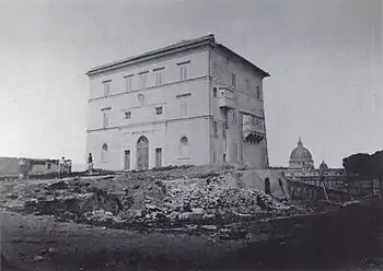The period of the villa's greatest beauty and prominence was between 1820 and 1840, when Charlotte Bonaparte Gabrielli was in residence there.[1] Some decadence had already begun in 1849 when the villa became the scene of harsh battles during the siege that ended the Roman Republic. In 1869, by the personal wish of Pope Pius IX, the villa was acquired by the papal administration from the Gabrielli family in order to expand the neighboring asylum of Santa Maria della Pietà.[1] The casino was thus restructured and expanded, and used to accommodate wealthy male retirees.[2]