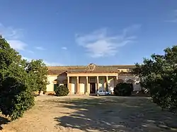 The house, which is low, is built around an open courtyard of two wings flanking the corps de logis, at the centre of which is a large Greek revival portico giving access to the villa. The windows are ornamented by alternating pointed and segmented pediments.