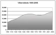 Villarrobledo (Spanish pronunciation: [biʎaroˈβleðo]) is a Spanish city and municipality in the province of Albacete, part of the autonomous community of Castilla-La Mancha. It's better known for having the world's largest area covered by vineyards (more than 30,000 has., approximately 48,000,000 of vines) as well as the world's greatest production of La Mancha wine, called in Spanish Denominación de Origen. Also, it is an important center of Manchego cheese production and export and has other important industries like metallurgy and transportation.