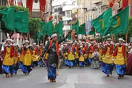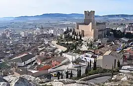 There is evidence of settlement in the area from Middle Paleolithic.[4] However, it is on dispute if the current city dates from visigothic times or before, though certainly it existed in the 11th century, during the Muslim period.[5] After the Christian conquest,[6] it became Seigneury, Principality, Duchy and finally Marquisate,[7] until the people, encouraged by the Catholic Monarchs, revolted against the marquis. In 1525 Charles V conceded the title of City to Villena.[8] This is the most economically prosperous period, as shown by the monuments that survived to nowadays. Although a railway station was inaugurated in 1858,[9] economy kept being mainly agricultural until the rural exode that took place in the 1960s. Then, the economic model changed rapidly so that currently economy is based mainly on tertiary sector and industry, chiefly footwear, construction and furniture.[10]