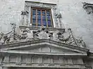 The coat of arms of Villena has been used traditionally since at least 1477, but has never been made official.[17] The castle in the first quarter comes from the symbol of the Crown of Castile, whereas the lion in the second quarter and the winged hand in the third are legacy of don Juan Manuel, second lord of the city. The three pinetrees and the pond in the fourth quarter refer to the Lagoon of Villena or the Fuente del Chopo, formerly big wealth sources for the city; the first as a salt evaporation pond and the second as a source of fresh water. The crown is a symbol of the marquisate of Villena. As the coat of arms has never made official, there are different versions according to the City Hall's terms of office, as well as certain polemic about the position of the second and third quarter.[17][18]