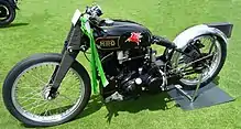 On 13 September 1948, Rollie Free achieved the US national motorcycle speed record at Bonneville Salt Flats in Utah riding the first Vincent Black Lightning. During test runs Free reached average speeds of 148.6 mph (239.1 km/h). To reduce drag, Free stripped to his swimming shorts for the final run, which he made lying flat with his legs stretched out and his head low, guiding the Vincent by following a black stripe painted on the salt bed. The stunt worked as Free covered the mile in 23.9 seconds, passing the 150 mph (240 km/h) barrier and on the return run he reached a record average speed of 150.313 mph (241.905 km/h).[6][7][8][4][9] This led to one of the most famous photographs in motorcycle history, known as the "bathing suit bike". The American Motorcyclist Association certified Free's record. Innovative features of the bike included the first-ever Vincent rear shock absorber, the first Mk II racing cams and horizontally mounted racing carburettors.[9][1] In 1950, Rollie Free returned to the Bonneville Salt Flats and broke his own record, averaging speeds of 156.58 mph (251.99 km/h) on the Vincent despite a high-speed crash during those speed trials.[6]
