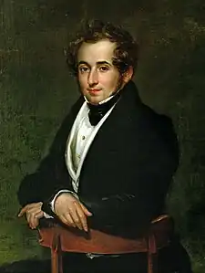 In addition, Bellini was introduced to the librettist Felice Romani, who proposed the subject of the composer’s first project, Il pirata, to which the young man willingly agreed especially when he realised that the story "provided several passionate and dramatic situations.. [and]..that such Romantic characters were then an innovation on the operatic stage."[30] A strong professional relationship with Romani began from that time; he became Bellini’s primary creative partner, providing the libretti for six of Bellini’s operas which followed, in addition to about 100 libretti written for the major composers of the day, up to and including Verdi.[31] As has been observed, "no other Italian opera composer of the time showed such an attachment to a single librettist"[32] and although Romani was known to treat composers poorly, he evidently had great respect for Bellini, even acceding to his requests for revisions.[33] For his part, Bellini admired "the sonorous and elegance of the poet's verses"[32]