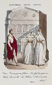 It was very successful, helped by the approval of the King, who broke the custom of there being no applause at a performance attended by royalty.[26] It was also attended by Donizetti who enthusiastically wrote to Simon Mayr: "It is beautiful, beautiful, beautiful, especially as it is his first opera."[27] Bellini's music was highly regarded, with the Giornale delle Due Sicilie on 13 June noting that "[several of the arias and duets] are some of the most laudable pieces of new music heard in recent times at the [San Carlo]."[26] However, there were reservations about Gilardoni's contribution.