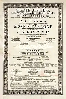 Zaira was the opera which came into being following discussions with Barbaja in Milan in June 1828 for a second opera for La Scala. At around the same time, Bellini reported to Florimo that he had been approached by Merelli about writing an inaugural opera for the soon-to-be completed Teatro Ducale (now the Teatro Regio) in Parma which was due to open during the following year[44] on 12 May 1829.[50] Initially, the opera was to be Carlo di Borgogna, but composer and librettist decided to tackle "a drama so ... hallowed as Voltaire's Zaïre",[51] but this proved to be more challenging for Romani than first imagined.
