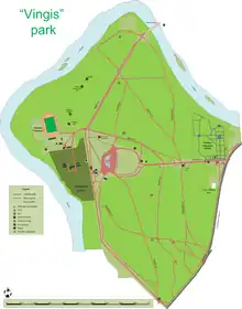 Vingis Park (Lithuanian: Vingio parkas) is the largest park in Vilnius, Lithuania, covering 162 hectares (400 acres). It is located in Vilkpėdė eldership near a curve of the Neris River, hence its Lithuanian name "vingis" which means "bend" or "curve". A pedestrian bridge connects the park with Žvėrynas. It is used as a venue for various events, especially concerts and sports competitions. It contains a stadium, an amphitheater and a department of the Botanical Garden of Vilnius University.