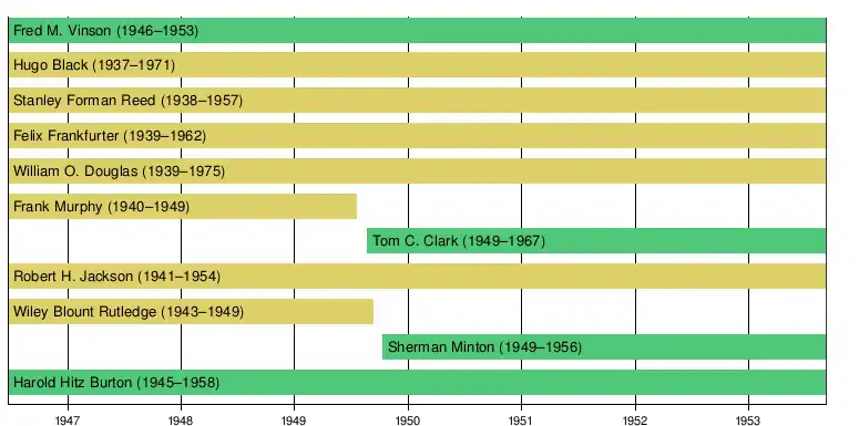 Presidents during this court included Harry S. Truman and Dwight D. Eisenhower. Congresses during this court included 79th through the 83rd United States Congresses.