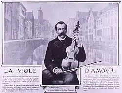 The viola d'amore (pronounced [ˈvjɔːla daˈmoːre]; Italian for "viol of love") is a 7- or 6-stringed musical instrument with sympathetic strings used chiefly in the baroque period. It is played under the chin in the same manner as the violin.[1]